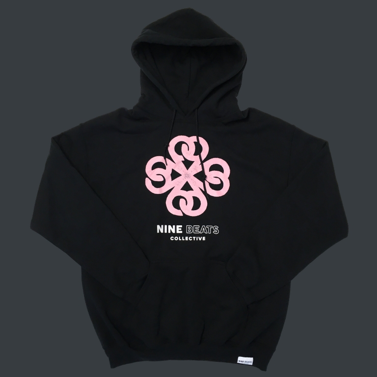 £17.99Pink NINE BEATS logo on black hoodie with hem tag (unisex)